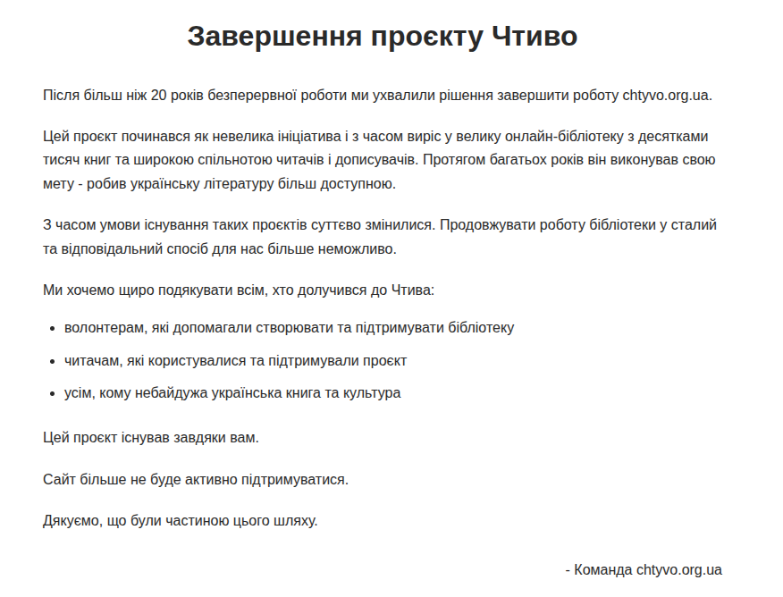"З часом умови існування таких проєктів суттєво змінилися. Продовжувати роботу бібліотеки у сталий та відповідальний спосіб для нас більше неможливо", — пояснила команда.